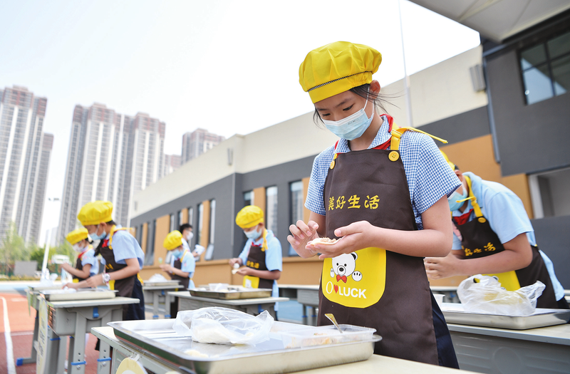 5月7日,西安市后宰门小学的学生参加包饺子比赛。5月7日,一场以“美好双手,美好生活”为主题的劳动技能大赛在西安市后宰门小学幸福校区举行。来自不同年级的学生分别参加叠衣服、包饺子、缝扣子、削果皮等项目的比赛。“双减”政策落地以来,西安市后宰门小学积极开展劳动教育与实践,通过多元化课程、生活化课堂培养学生的动手能力,促进学生体验劳动乐趣、增强劳动意识。