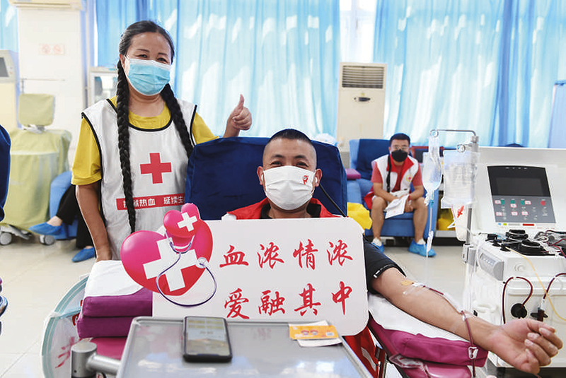 6月14日,志愿者在位于呼和浩特市的内蒙古自治区血液中心献血合影。当日是第19个“世界献血者日”。内蒙古自治区红十字会联合内蒙古自治区卫生健康委员会在内蒙古自治区血液中心举办无偿献血宣传活动,活动吸引不少爱心人士前来参加。
