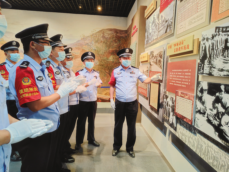 近日,朔州车站派出所组织全体民警在塞北革命纪念馆开展七一主题党日活动。图为民警们认真聆听革命前辈奋勇抗 日的英雄事迹。 杨和摄