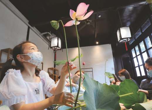 7月17日,在江苏苏州古典园林拙政园,一名小朋友在家长陪同下体验夏荷插花。暑假期间,孩子们积极参加丰富多彩的各类活动,快乐度过假期。