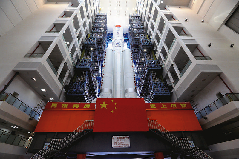7月18日,问天实验舱与长征五号B遥三运载火箭组合体在测试厂房等待转运。当日,问天实验舱与长征五号B遥三运载火箭组合体转运至发射区,将于近日择机实施发射。