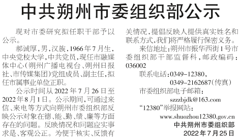 中共朔州市委组织部公示