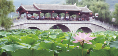 7月25日,游人在陕西省商洛市丹凤县棣花古镇的风雨桥上观赏荷花。近日,秦岭深处的陕西省商洛市丹凤县棣花古镇荷花盛开,吸引游人前来观赏。
