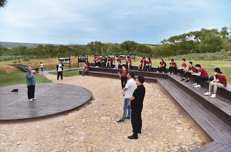 近日,北大元培学院20多名师生在朔开展思想政治实践活动,体验朔州朴实的风土人情,改革、转型与创新成果,学习弘扬右玉精神。图为元培学院师生在右玉干部学院黄沙洼现场教学点听取“红姑娘突击队”队长王明花老人讲述造林的故事。 薛礼伟摄