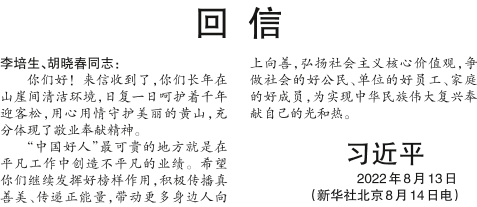 新华社北京8月14日电 中共中央总书记、国家主席、中央军委主席习近平8月13日给安徽黄山风景区工作人员李培生、胡晓春回信,对他们继续发挥“中国好人”榜样作用提出殷切期望。