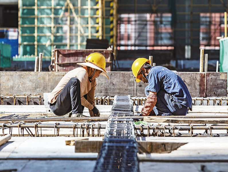 8月13日,工人在黔西市棚户改造项目工地施工作业。
