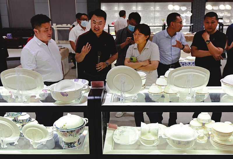 8月10日,客商在应县富彩陶瓷有限公司的产品展厅了解各档日用陶瓷商品。该企业将煤矸石加工成陶瓷产业链上游的高岭土,使煤矸石的市场价值提升了30%,生产的日用陶瓷在线上和线下赢得良好口碑。目前,以煤矸石消化利用为主的日用陶瓷产业,已成为应县经济发展的重要支柱型产业。 孙荣祥 摄
