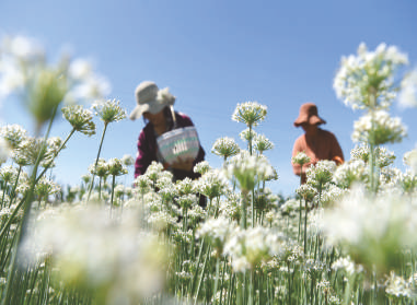 8月23日,山东省淄博市沂源县悦庄镇朱家庄村的农民在采摘韭菜花。当日是处暑节气,农民抢抓农时积极开展农事活动。 新华社发 赵东山 摄