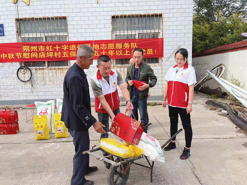 9月3日,市红十字会退伍基地志愿服务队的志愿者们赴朔城区下团堡乡店坪村,慰问村里的五保户和五十年以上老党员等,为老人们分别送上了月饼、米、面等物品,同时送上中秋祝福,祝愿老人们中秋快乐,身体健康。 刘淑花 摄