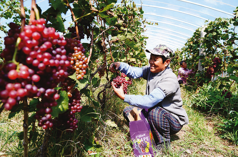 9月24日,在惠民县胡集镇惠台葡萄专业合作社,村民在采摘葡萄。山东省惠民县近年来着力打造省级乡村振兴齐鲁样板示范区,充分发挥基层党组织战斗堡垒作用,通过党组织领办合作社,发展特色农业,促进农业增效、农民增收,赋能乡村振兴。
