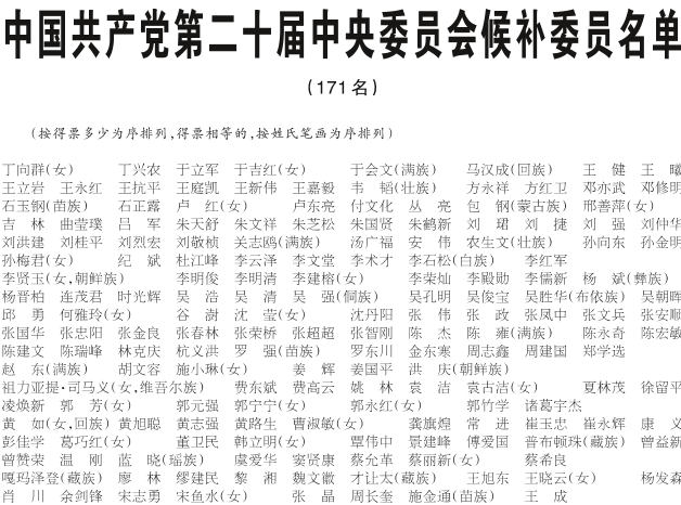 中国共产党第二十届中央委员会候补委员名单