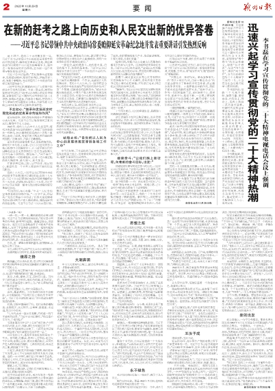 习近平总书记的重要讲话在广大党员干部群众中引发热烈反响。大家一致表示,要更加紧密地团结在以习近平同志为核心的党中央周围,全面贯彻习近平新时代中国特色社会主义思想,赓续红色血脉、传承奋斗精神,把党的二十大擘画的宏伟蓝图变为现实,在新的赶考之路上向历史和人民交出新的优异答卷。