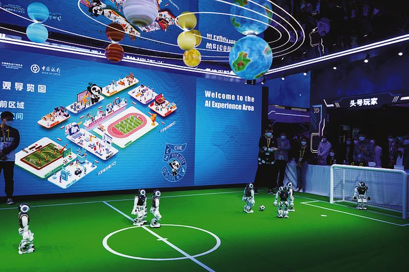 11月5日,参观者在第五届进博会技术装备展区人工智能专区观看机器人表演。