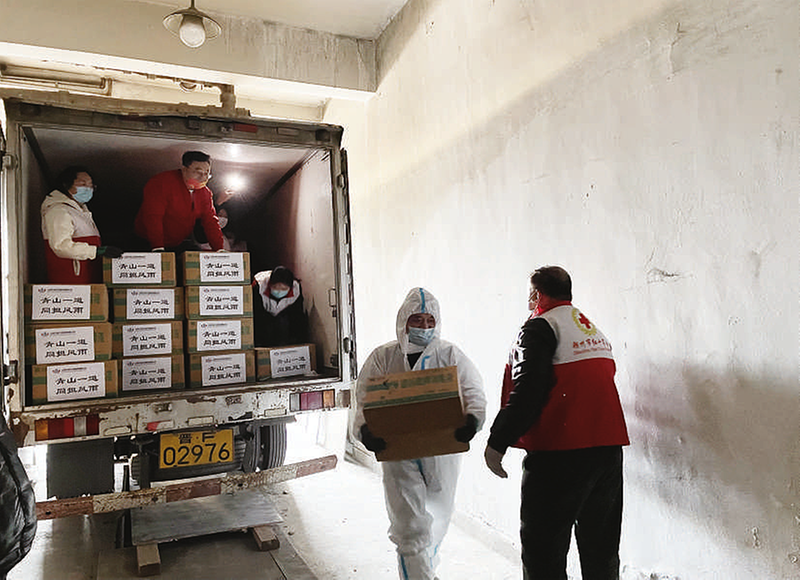 日前,为助力我市新冠肺炎疫情防控,山西宏瑞企业服务有限公司向市红十字会捐赠了价值3万元的消毒液一百箱,共计约2.5吨。贴着“青山一道、同担风雨”的一百箱消毒液由中国邮政集团有限公司朔州市分公司全程“安全护送”回我市。图为市红十字会工作人员在搬运分装物资。