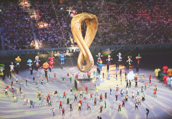 11月20日,2022年卡塔尔世界杯开幕式在海湾球场举行。图为本届世界杯会徽出现在开幕式现场。 新华社记者 肖艺九摄
