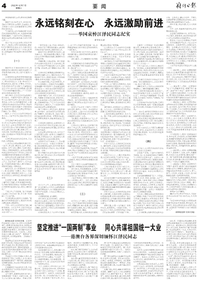 新华社北京12月6日电 江泽民同志追悼大会6日在人民大会堂隆重举行,港澳台同胞通过电视、网络收看直播,沉痛悼念这位公认的享有崇高威望的卓越领导人,深切缅怀他的丰功伟绩和崇高风范。大家表示,将化悲痛为力量,奋力续写“一国两制”事业新篇章,为实现国家统一、民族复兴共同奋斗。