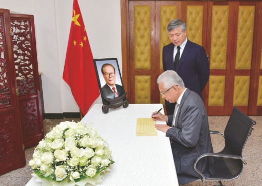 12月6日,马来西亚总理安瓦尔(右二)在中国驻马来西亚大使馆吊唁江泽民同志。