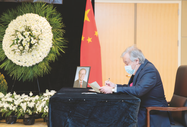 十二月五日,联合国秘书长古特雷斯在中国常驻联合国代表团驻地吊唁江泽民同志。