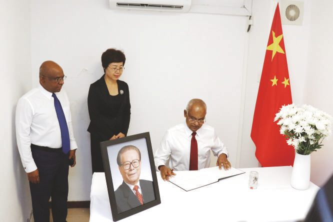 12月5日,马尔代夫总统萨利赫(右)在中国驻马尔代夫大使馆吊唁江泽民同志。