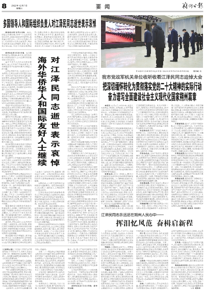 市人大常委会机关:干部职工深切缅怀江泽民同志的光辉业绩,深刻感悟江泽民同志的精神风范。机关干部职工表示,要继承江泽民同志的遗志,把对江泽民同志的哀思转化为贯彻落实党的二十大精神的实际行动,更加自觉地团结在以习近平同志为核心的党中央周围,以党的二十大精神为指引,结合市人大常委会的立法、监督、代表等工作,努力把学习成果转化为推动工作的实际能力,依法履行好宪法和法律赋予的各项职能,踔厉奋发、勇毅前行,为建设现代化的塞上绿都作出新的更大的贡献。