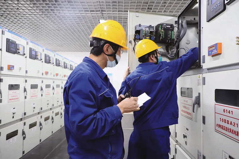 近日,朔州经济开发区重点企业华电朔州热电分公司电气设备巡检人员在认真核对设备参数,精心操作,保障电力、热力生产安全。 麻洁琼 摄