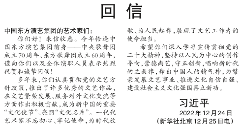 新华社北京12月25日电 中共中央总书记、国家主席、中央军委主席习近平12月24日给中国东方演艺集团的艺术家们回信,勉励他们深入学习宣传贯彻党的二十大精神,为建设社会主义文化强国再立新功。