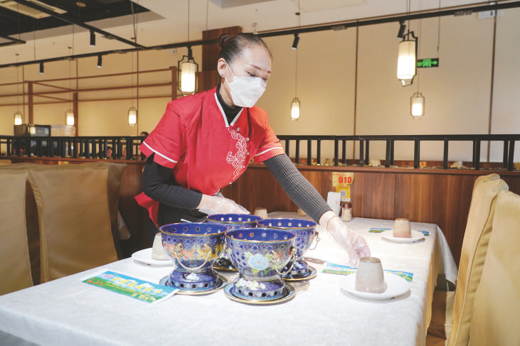 在北京世纪金源购物中心的一家餐厅,工作人员摆放餐具。近日,北京持续推进企业复工复产,多措并举稳经济、促消费,各大商圈客流量增多,“烟火气”逐渐回归。 新华社记者 任超摄