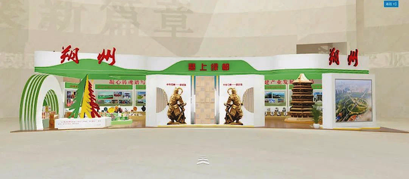 第五届山西文化产业博览交易会(云上文博会)朔州线上VR展馆以“现代化的塞上绿都”为主题,展馆以绿色为主色系,以3D形式体现应县木塔、中华门神、朔州陶瓷、内外长城、右玉丰碑等朔州特色文化元素,展现朔州市大力弘扬右玉精神和改革开放精神,全力打造“四大高地”,加快建设现代化塞上绿都的发展成就。线上VR展馆南入口处设置尉迟恭雕像模型,西侧设置右玉丰碑模型,展厅中设置应县木塔模型。点击尉迟恭铜像模型和“朔”字造型,出现尉迟恭简介和门神文化介绍文字。从入口处右侧进入展厅后,照壁后方有三个展示单元,点击左侧“热点”,即可浏览朔州概况。