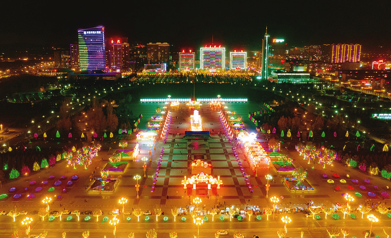 大红灯笼挂起来,五彩灯光亮起来。漫步在流光溢彩的道路上,各类树枝上都挂满了彩灯装饰,各种题材的彩灯展随处可见,万千花灯点亮朔州大地。图为市人民公园灯展腑瞰图。 高文武摄