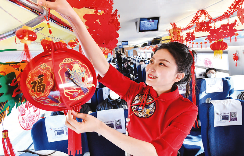 2月4日,沈阳客运段列车工作人员在列车上挂上花灯。2月4日,一场以“玉兔纳福盈如意,高铁团圆庆元宵”为主题的高铁灯会在G8039次列车上举行。 新华社记者杨青 摄