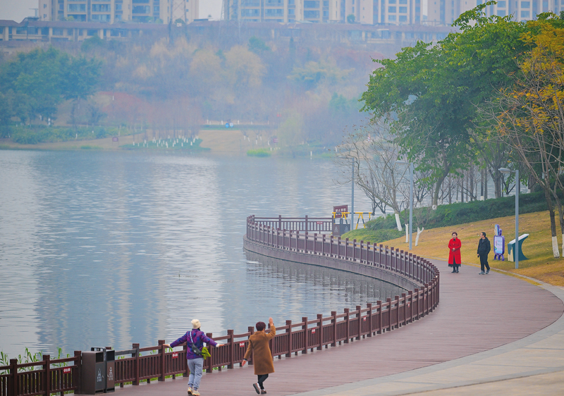 市民在眉山市仁寿县城市湿地公园散步休闲。近年来,四川眉山市仁寿县围绕“生态打底”理念,加大境内的黑龙滩水库、城市湿地公园等建设保护力度,做足“绿”、做活“水”、做美“景”,将山、水、林、湖融入城市建设中,改善了人居环境,提升群众幸福感、获得感。 新华社记者 王曦 摄