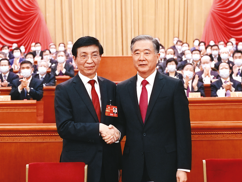 三月十日,全国政协十四届一次会议在北京人民大会堂举行第三次全体会议。当会议主持人宣布王沪宁当选政协第十四届全国委员会主席后,汪洋起立祝贺,与王沪宁热烈握手。 新华社记者李学仁摄