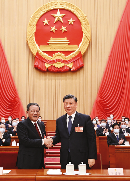 3月11日,十四届全国人大一次会议在北京人民大会堂举行第四次全体会议,根据国家主席习近平的提名,经过投票表决,决定李强为中华人民共和国国务院总理。这是习近平同李强握手。 新华社记者李学仁 摄