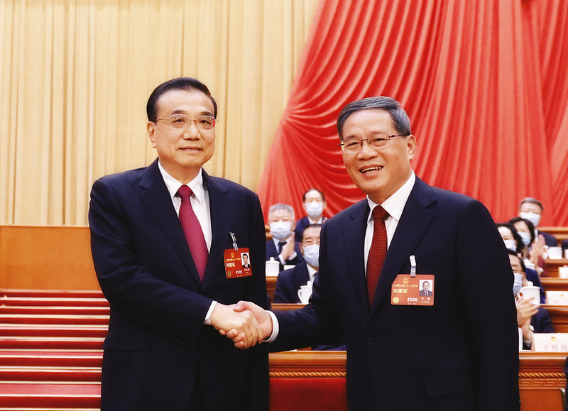 三月十一日,十四届全国人大一次会议在北京人民大会堂举行第四次全体会议,根据国家主席习近平的提名,经过投票表决,决定李强为中华人民共和国国务院总理。这是李强同李克强握手。 新华社记者黄敬文摄