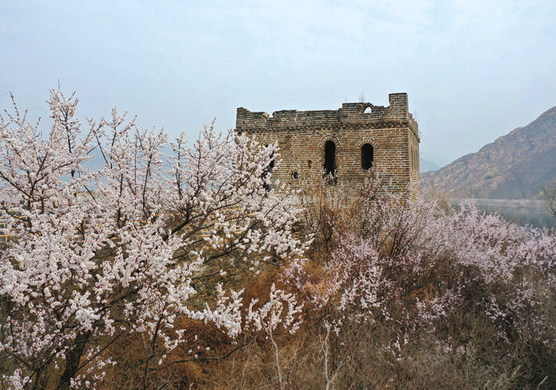 这是4月2日拍摄的喜峰口长城景色。春暖花开时节,位于河北省宽城满族自治县的喜峰口水下长城两侧山花开放,绽放的花朵与古长城相映成景,吸引游人前往游览。新华社发刘环宇摄