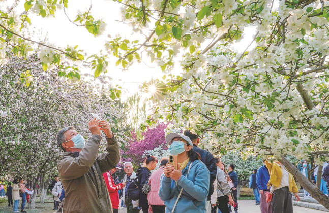 4月5日,人们在北京元大都城垣遗址公园赏花。清明假期,人们纷纷来到户外踏青休闲,感受春天的气息。 新华社记者陈晔华 摄