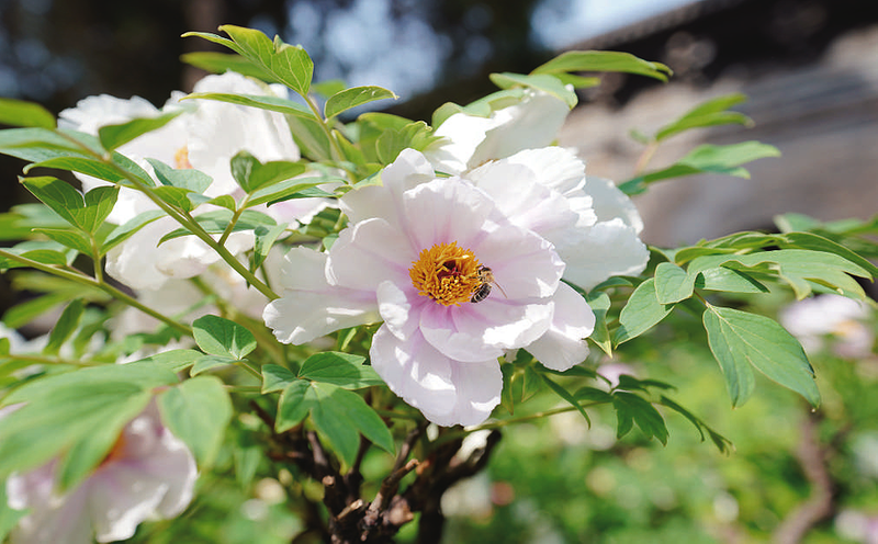5月8日,在太原双塔寺景区,蜜蜂在花间采蜜。近日,山西太原双塔寺景区的数千株牡丹花竞相绽放,吸引游人前来观花赏景。