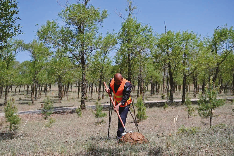 护林员马裕在林场空地补种树苗(5月18日摄)。