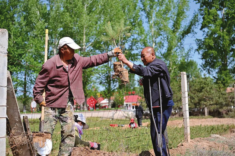 在山西省右玉县薛家堡村一处苗圃,护林员马裕从工作人员手中接过树苗准备去林场空地补种(5月18日摄)。