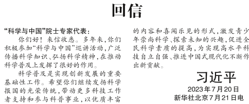 习近平在回信中说,多年来,你们积极参加“科学与中国”巡讲活动,广泛传播科学知识、弘扬科学精神,在推动科学普及上发挥了很好的作用。