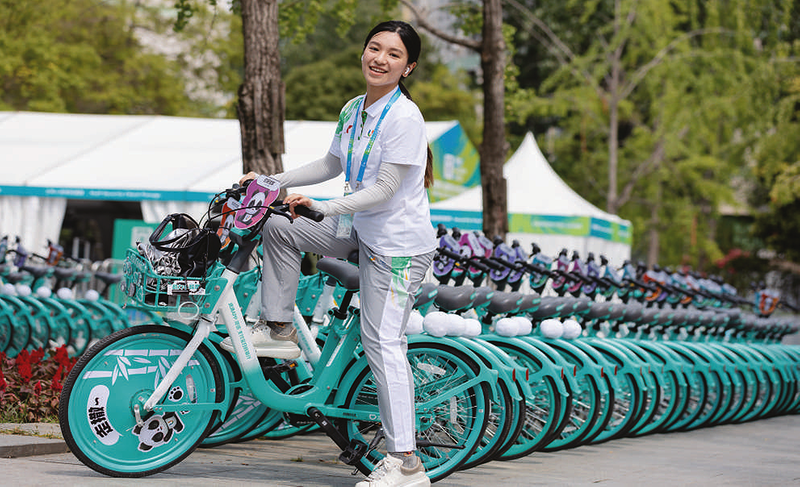 7月20日,一名志愿者骑着大运会定制共享单车留影。以大运会吉祥物“蓉宝”作为主元素的定制单车已在校园和街头投放使用。第31届世界大学生夏季运动会将于7月28日至8月8日在成都举行。丰富多样的大运会主题元素装点成都街头,大运会氛围浓郁。 新华社记者 江宏景 摄