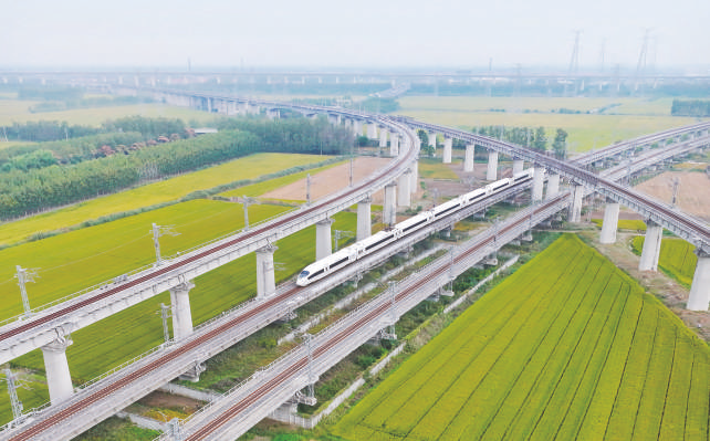 10月10日,一列动车组列车行驶在江苏连云港市。10月11日零时起,全国铁路将实行第四季度列车运行图。 新华社发 王健民 摄