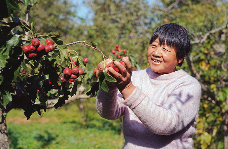 10月10日,村民在北京市平谷区熊儿寨乡魏家湾村的一处红果种植园采摘红果。金秋时节,位于北京市平谷区熊儿寨乡魏家湾村的红果丰收,村民采摘、装箱,一片繁忙景象。