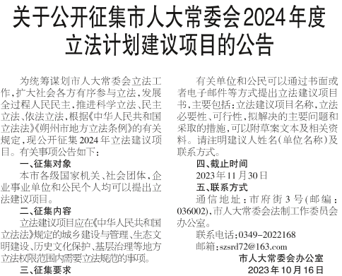 关于公开征集市人大常委会2024年度立法计划建议项目的公告