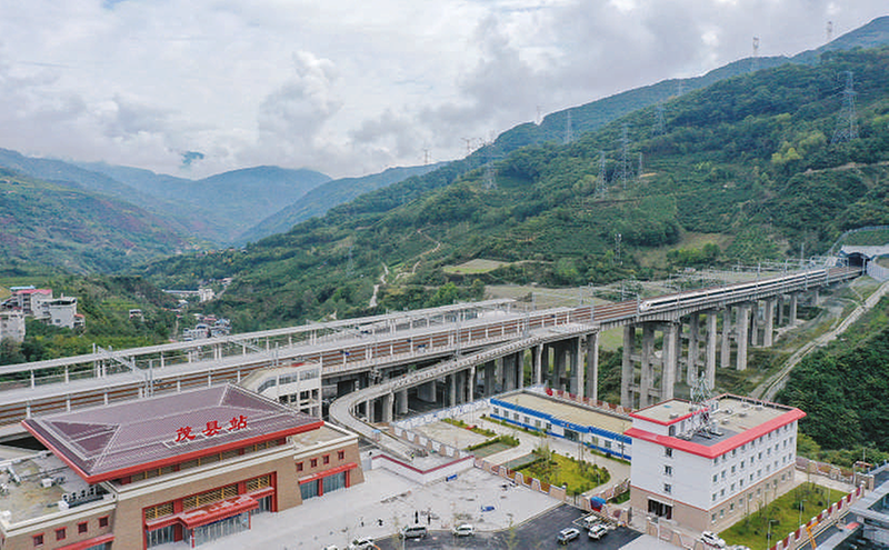 调试列车驶入川青铁路茂县站。11月28日,川青铁路四川首段青白江东至镇江关段贯通运营。该段铁路共设10个车站,起自成都,途经三星堆、什邡西、绵竹南、安州、高川、茂县等站,至海拔2503米的阿坝藏族羌族自治州松潘县镇江关站。