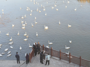 12月1日,游人在三门峡市天鹅湖国家城市湿地公园观赏天鹅。河南省三门峡市凭借适宜的气候、优良水生态和安全的环境,每年秋冬之际成为我国境内大天鹅栖息越冬的主要目的地之一。 新华社记者鲁鹏摄