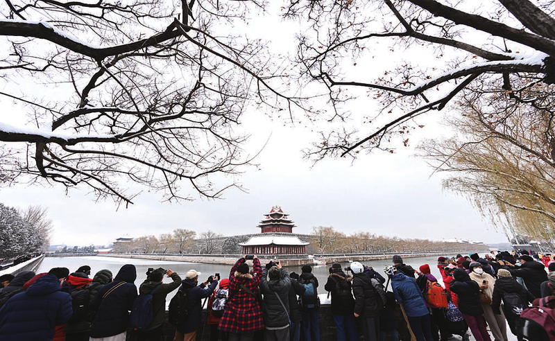 12月11日,人们在故宫角楼附近拍摄雪景。自12月10日夜间开始,北京全市各地陆续降雪。北京市气象部门预计,12月11日仍有小雪或零星小雪。 新华社记者 李鑫摄