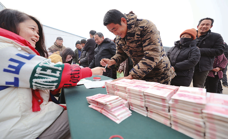 12月28日,山东省临沂市沂南县苏村镇蔬香瓜田蔬菜种植农民专业合作社联合社举行股民分红大会,477名农民现场领取了共计70多万元的红利。据了解,2018年以来,苏村镇积极探索乡镇党委领办联合社发展模式,按照“支部引领、集体持股、群众参股”的方式,整合10个村级经济股份合作社和477户农民加入到联合社中,依托当地资源优势,大力发展蔬菜种植、批发销售等产业,在壮大村级集体经济的同时,带动农民在家门口增收致富。 新华社发 王彦冰 摄