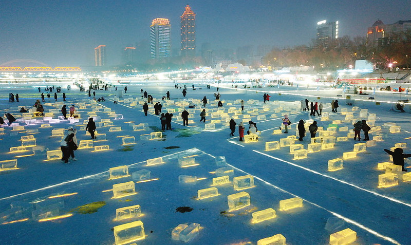 游客在哈尔滨松花江冰雪嘉年华景区的“冰光秀场”游玩、拍照(无人机照片,1月3日摄)。近日,在哈尔滨松花江冰雪嘉年华景区江面上,一处由冰块和灯光组合成的开放式“冰光秀场”亮相,吸引游客前来游玩、拍照。