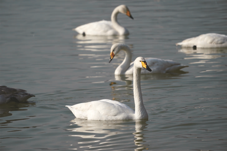 1月9日,白天鹅在山西平陆黄河湿地水面上游弋。占地6000多公顷的山西平陆黄河湿地位于山西、河南两省交界处,这里气候温和、采食丰富,非常适宜白天鹅越冬。每年秋末冬初,白天鹅就会成群结队地从俄罗斯西伯利亚地区陆续飞临这里越冬。 新华社记者 詹彦摄